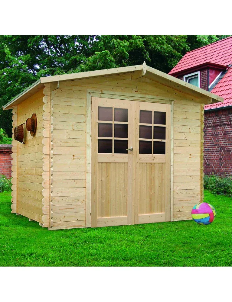Chalet de jardin fabriqué en sapin certifié provenant d’Europe du Nord. Espace intérieur: 6,25 m². Son épaisseur de 19 mm garantit une très bonne isolation. Ventilation incluse. Système Place and Plug garantissant un montage facile. Double porte low-entry avec fenêtre en verre, serrure à clé avec sécurité enfant.