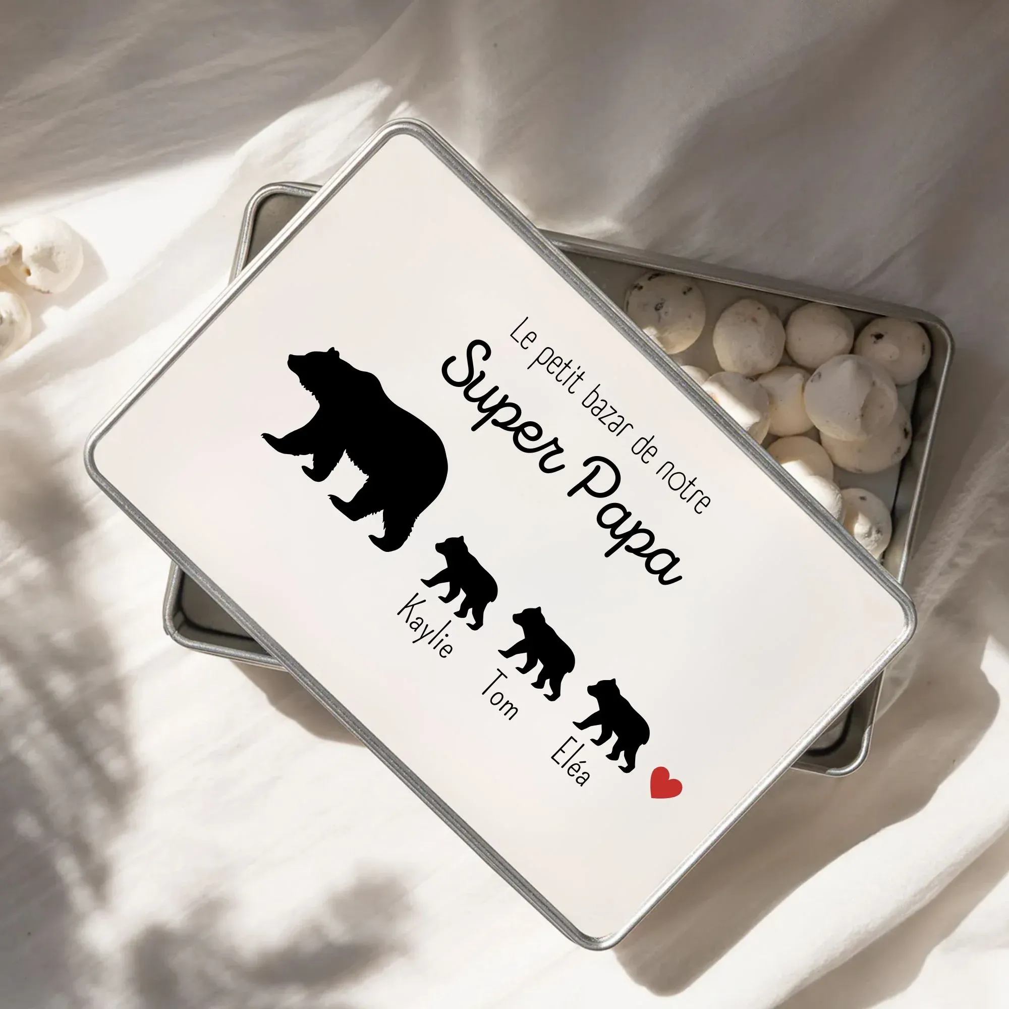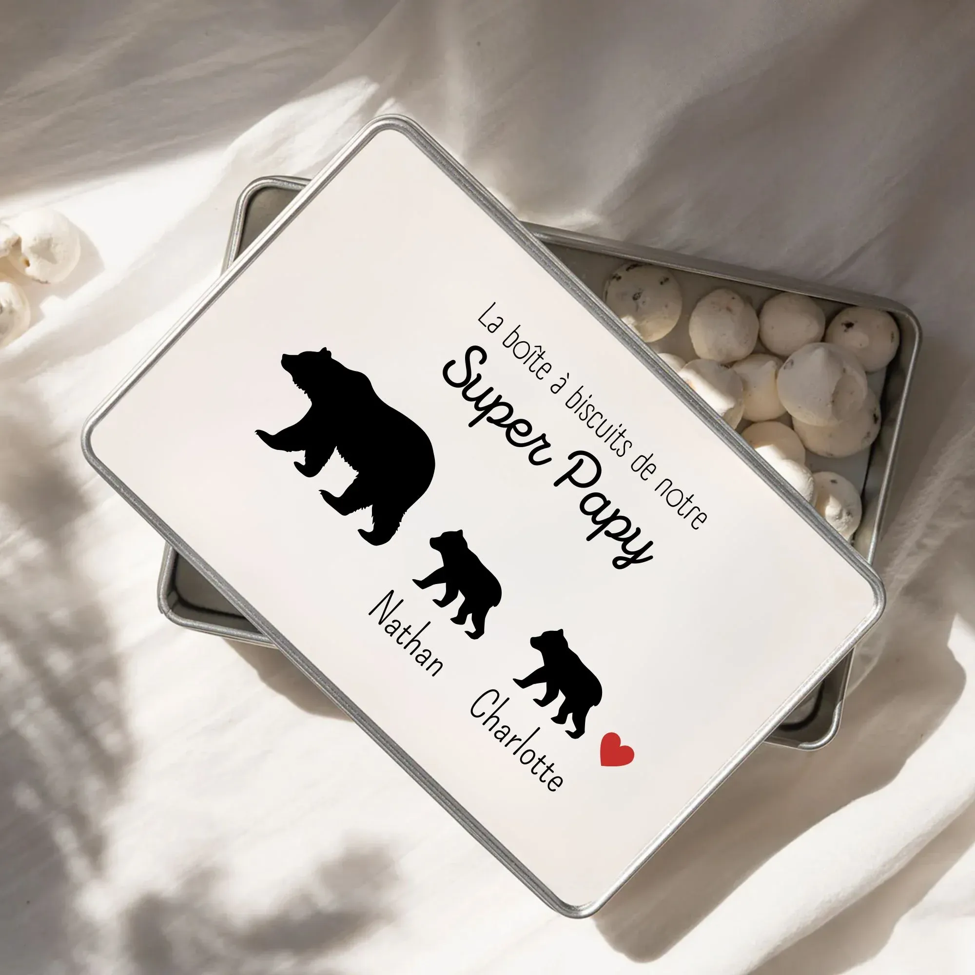 Offrez à votre papy ou papa un cadeau unique et mémorable avec notre boîte en métal personnalisée. Parfaite pour ranger des biscuits, d’autres douceurs ou de petits accessoires, cette boîte combine à la fois élégance et fonctionnalité.