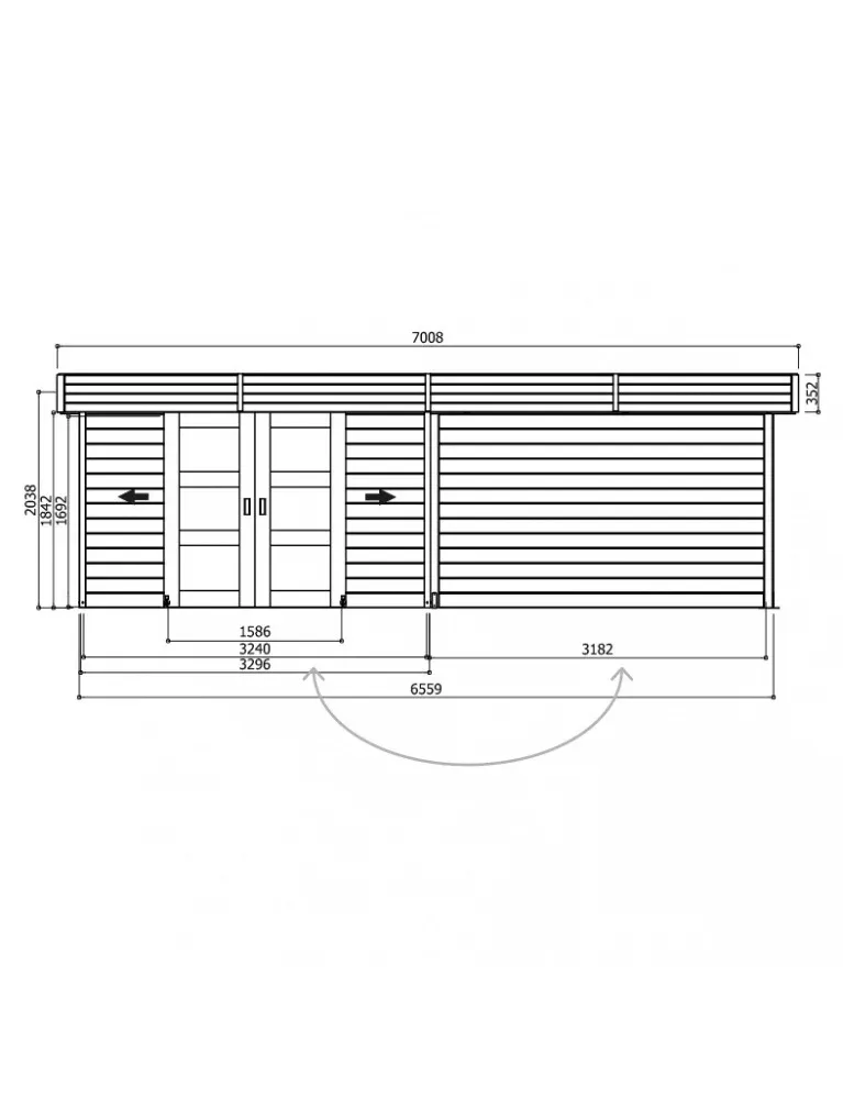 | Largeur hors débordement du toit | 3,296 m + 3,182 m (terrasse couverte) |
