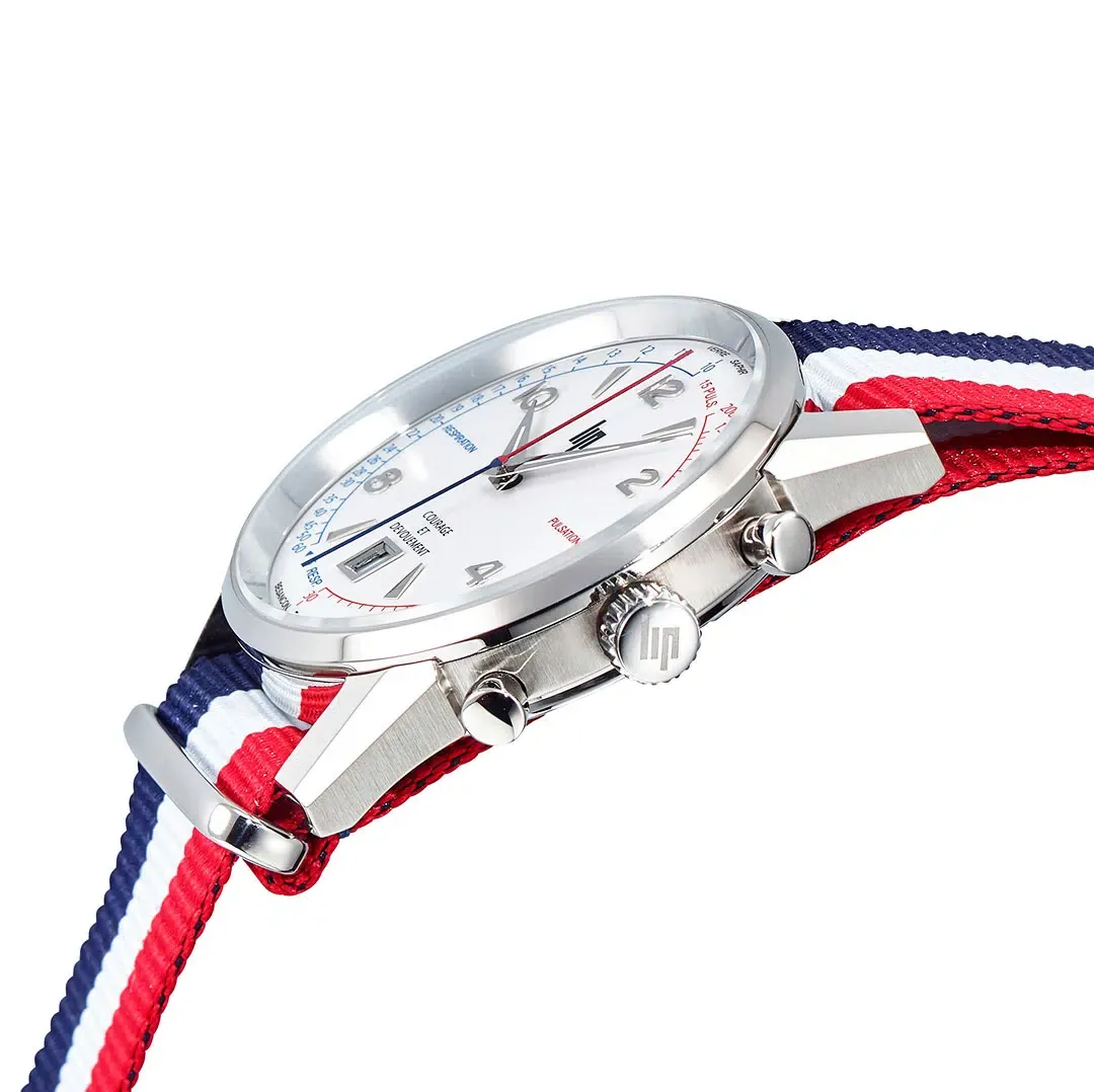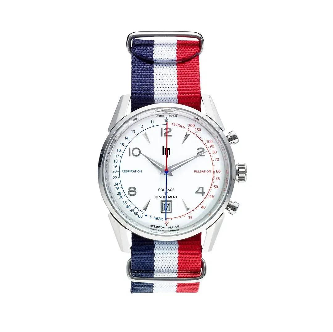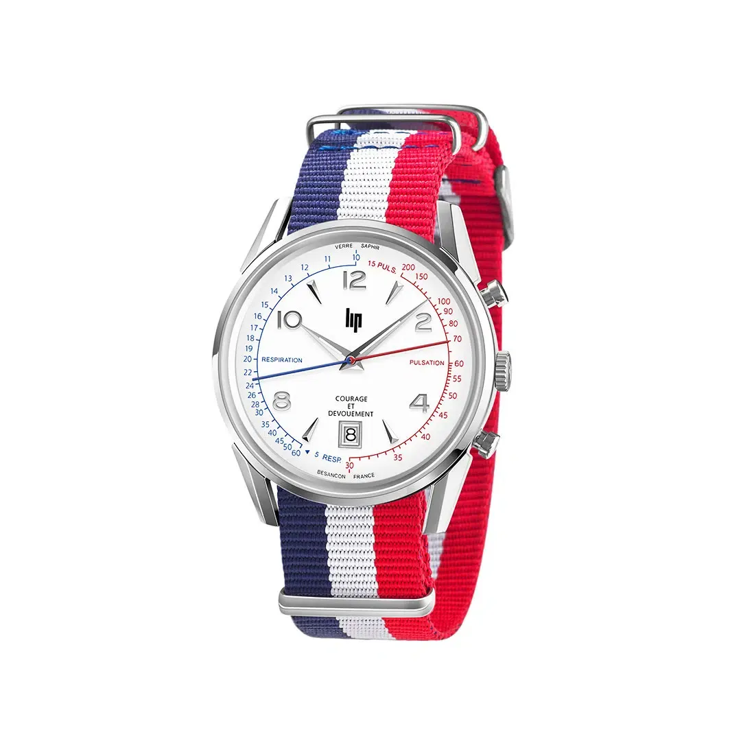 La montre LIP Courage a été développée en partenariat avec la Fédération Nationale des Sapeurs-Pompiers de France, comme un outil d’aide à la décision pour tous les métiers du secourisme : pompiers, médecins, infirmiers et secouristes bénévoles. Elle fonctionne grâce à une échelle cardiaque imprimée sur la droite du cadran en rouge, et une échelle respiratoire imprimée sur la gauche du cadran en bleu. Un mouvement chronographe exclusif, avec une aiguille double : une partie rouge pour la mesure des pulsations cardiaques et une partie bleue pour la mesure des respirations, permet un contrôle très rapide des fonctions vitales.